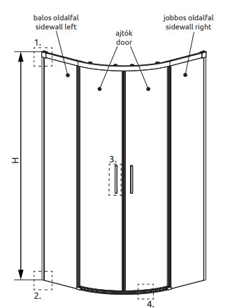 Íves zuhanykabin, duplaajtós görgős kivitel oldalt két fix résszel.