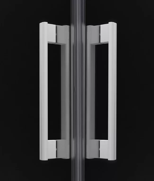 Szögletes fehér zuhanykabin görgős dupla ajtóval, fix résszel.