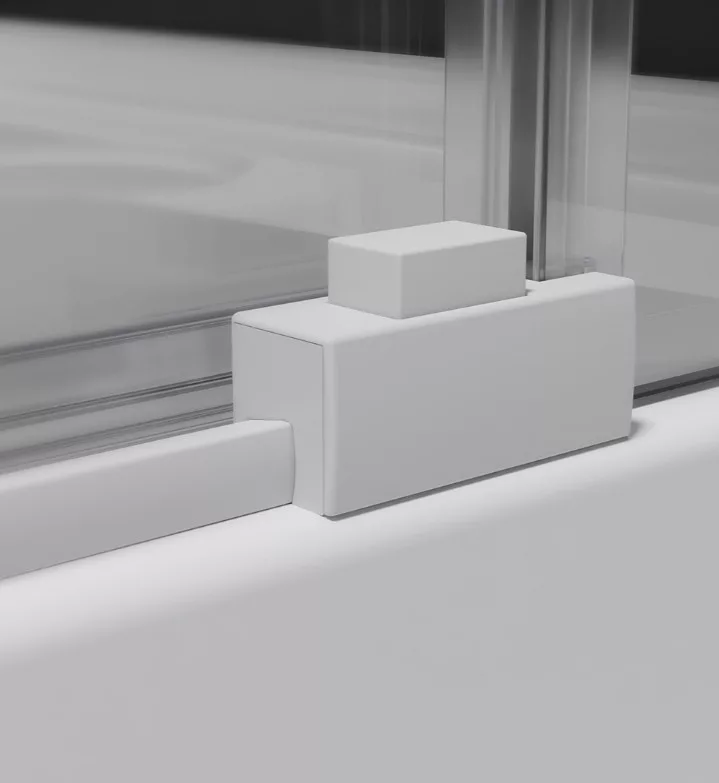 Szögletes fehér zuhanykabin egy görgős ajtóval és egy fix oldalfallal.
