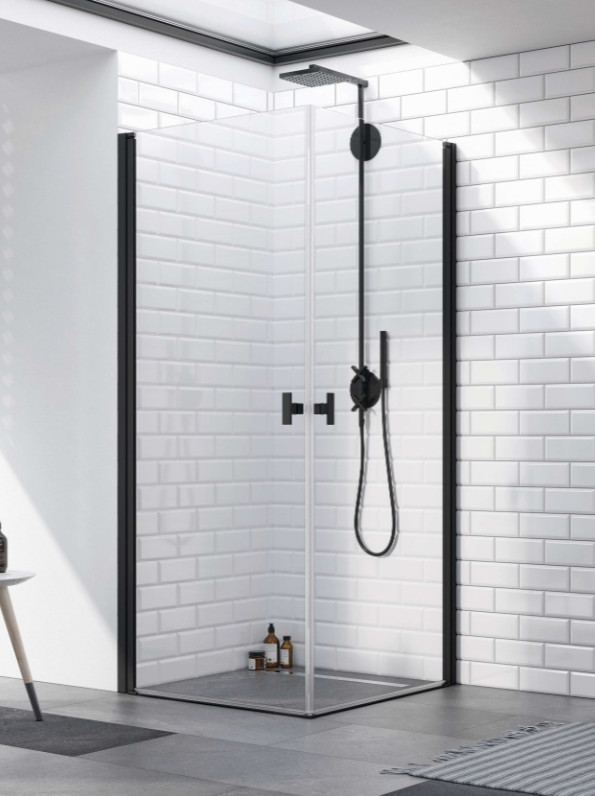 Szögletes fekete zuhanykabin teljesen a falra hajtható dupla nyílóajtóval.