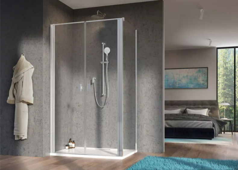 Szögletes zuhanykabin dupla nyílóajtóval és egy fix oldalfallal.