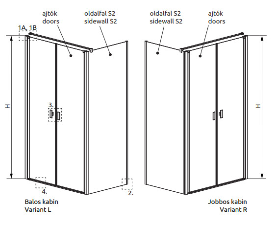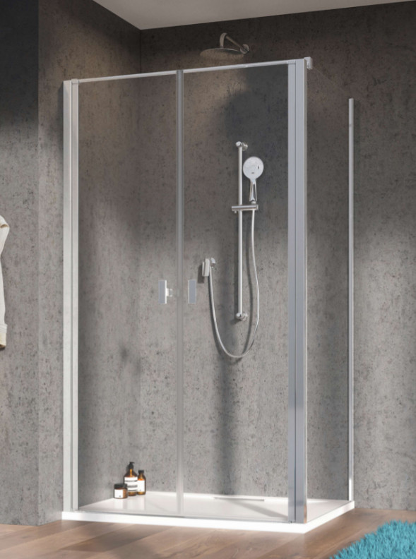 Szögletes zuhanykabin dupla nyílóajtóval és egy fix oldalfallal.