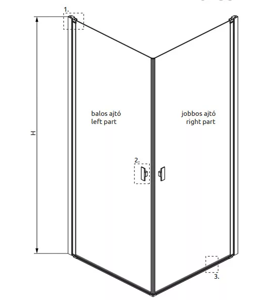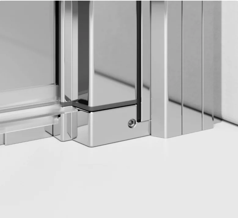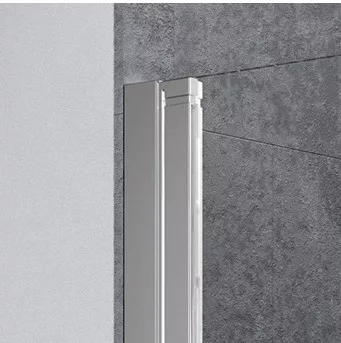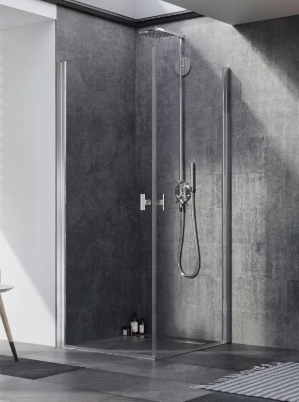 Szögletes zuhanykabin teljesen a falra hajtható dupla nyílóajtóval.