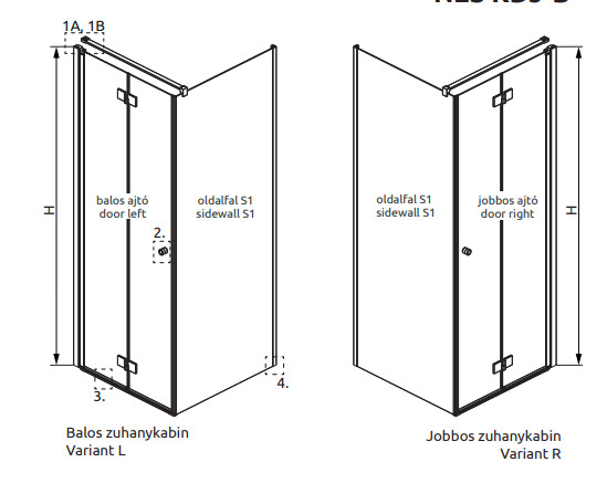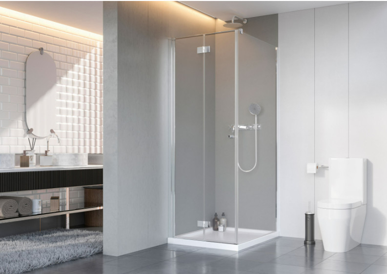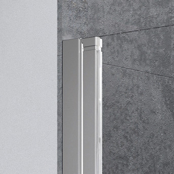 Kifelé-befelé nyíló szögletes zuhanykabin egy fix és egy nyíló oldallal.