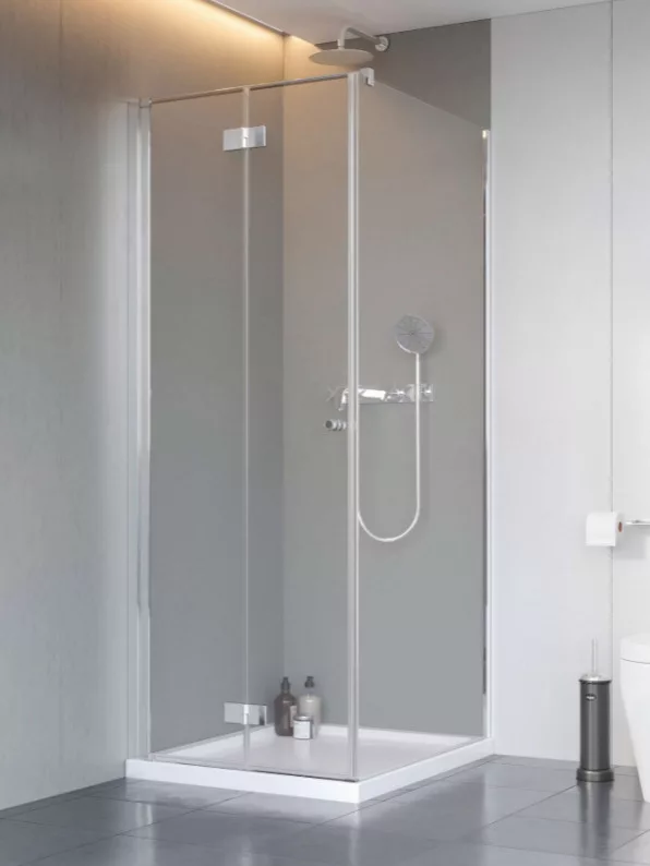 Kifelé-befelé nyíló szögletes zuhanykabin egy fix és egy nyíló oldallal.