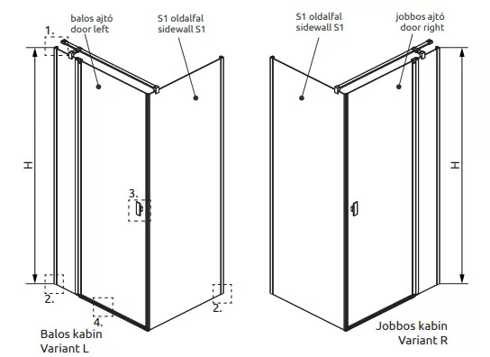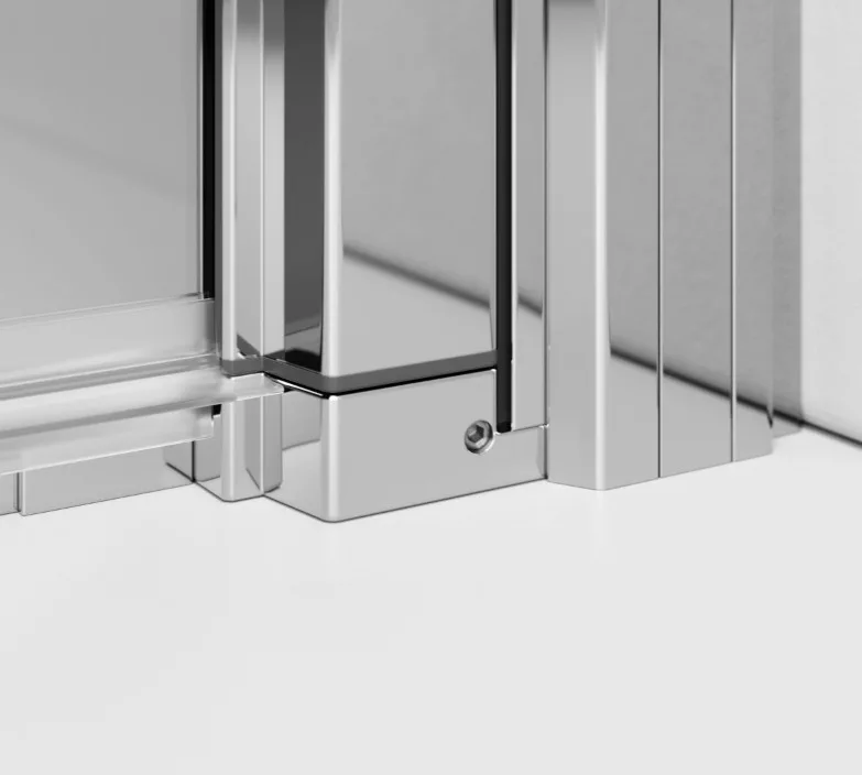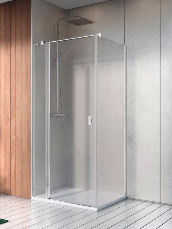 Kifelé-befelé nyíló szögletes zuhanykabin egy fix és egy nyíló oldallal.