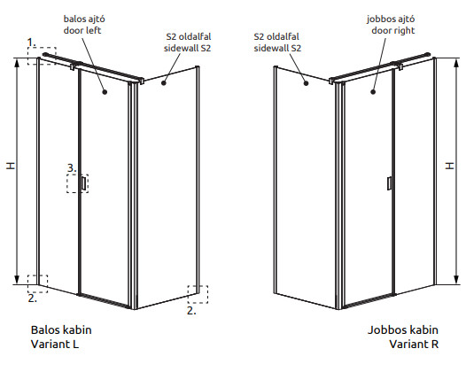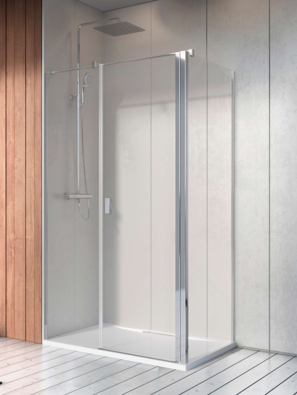 Kifelé-befelé nyíló szögletes zuhanykabin egy fix és egy nyíló oldallal.