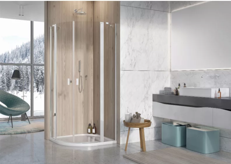 Íves zuhanykabin oldalt két fix résszel, dupla nyílóajtóval.