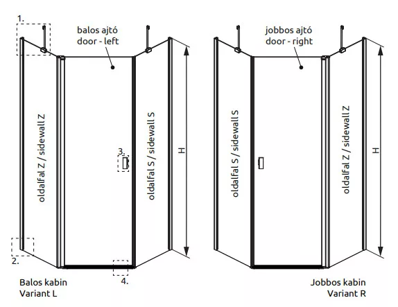 Ötszögletű zuhanykabin két fix résszel, kifelé nyíló ajtóval.