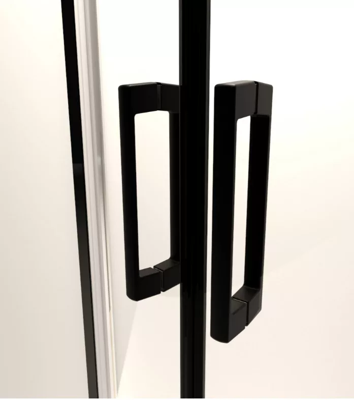 Szögletes fekete zuhanykabin görgős tolóajtóval és egy fix oldalfallal.