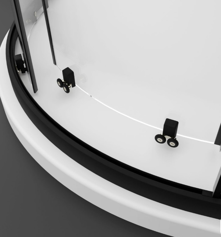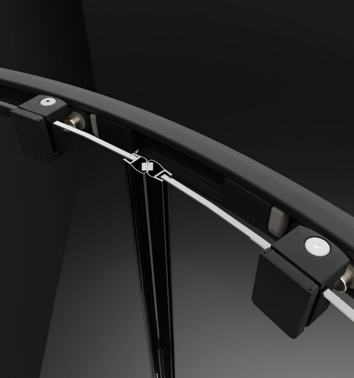 Íves fekete zuhanykabin két fix résszel és dupla tolóajtóval.