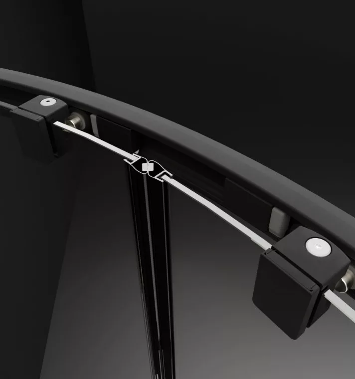 Íves fekete zuhanykabin két fix résszel és dupla tolóajtóval.