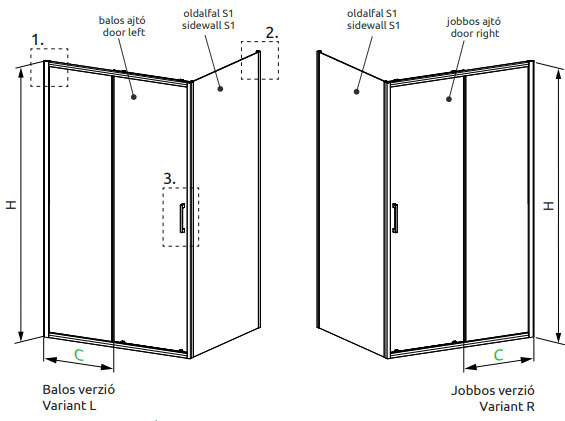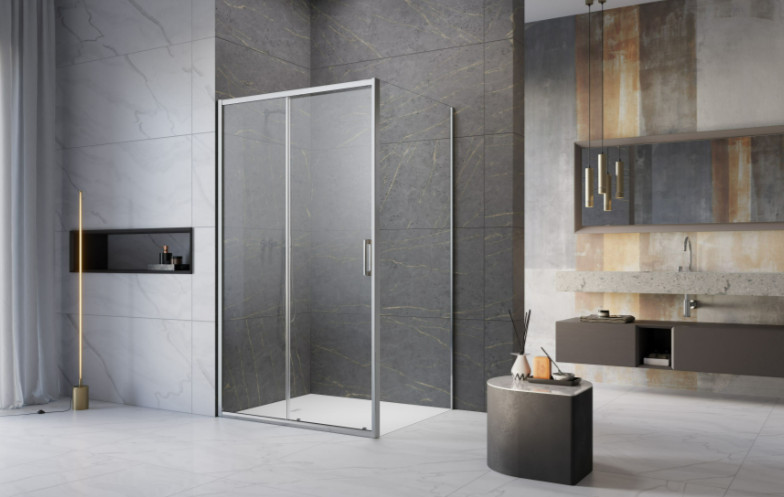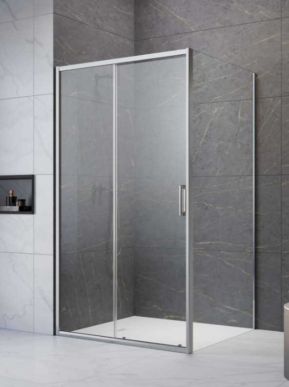Szögletes zuhanykabin görgős tolóajtóval és egy fix oldalfallal.