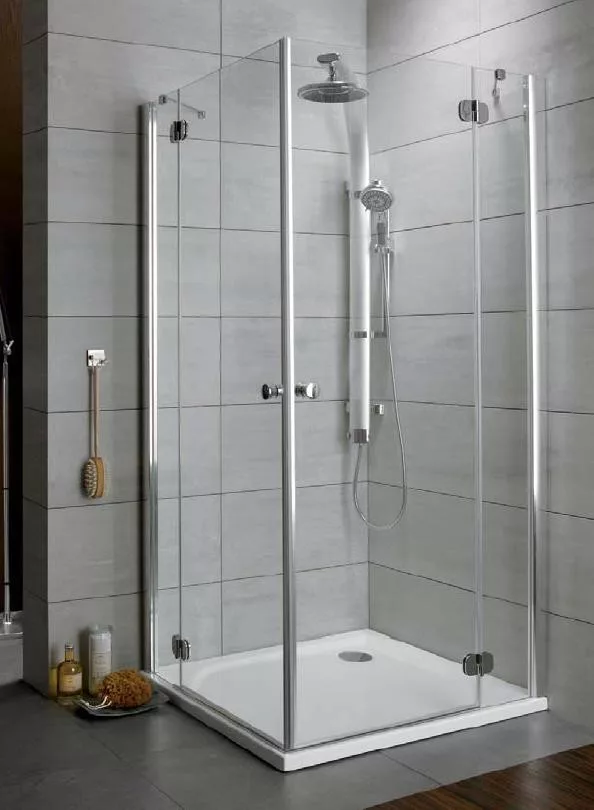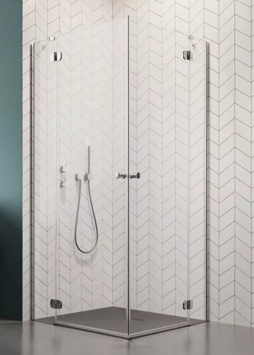 Kifelé nyíló szögletes zuhanykabin dupla ajtóval, fix résszel