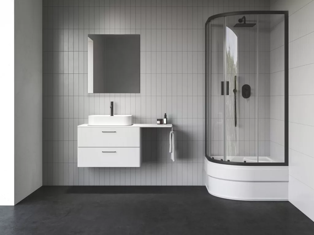 Az alacsony Blix II negyedköríves zuhanykabin magassága csak 1800 mm, így alkalmas a Sabina mély ülőkés zuhanytálcához.