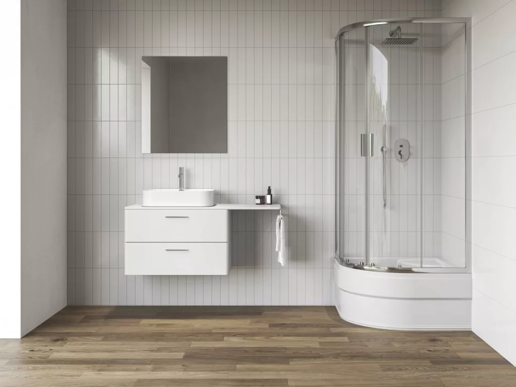 Az alacsony Blix II negyedköríves zuhanykabin magassága csak 1800 mm, így alkalmas a Sabina mély ülőkés zuhanytálcához.