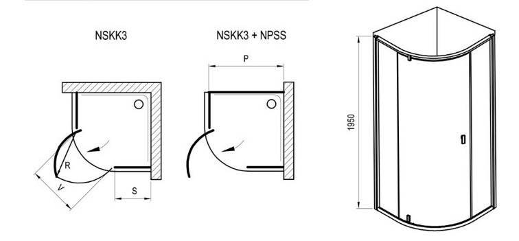 A termék két egyenes fix részből és egy íves nyíló elemből áll, amely a termék ajtaját képezi. A termék 180°-os megfordításával választhatunk a balos vagy jobbos változat között.