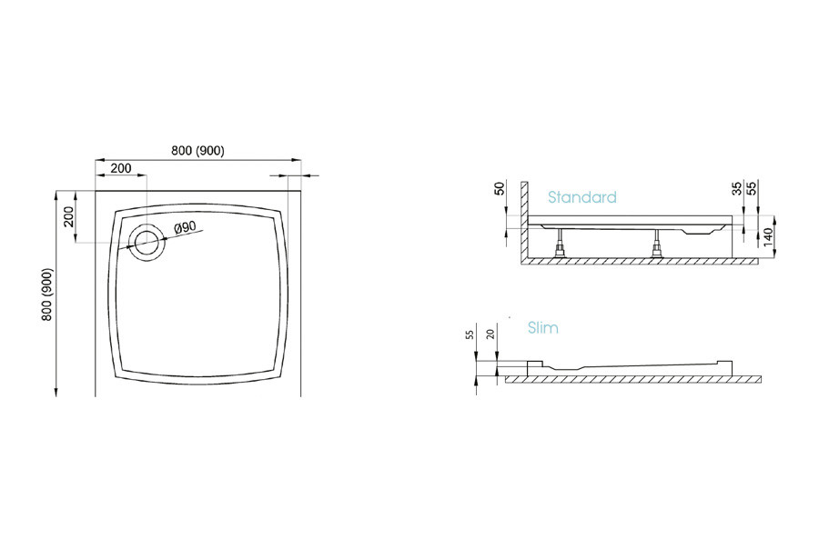 Zuhanytálca, H2O Nero D slim szögletes aszimmetrikus 100x80