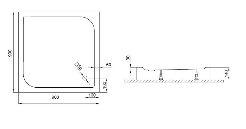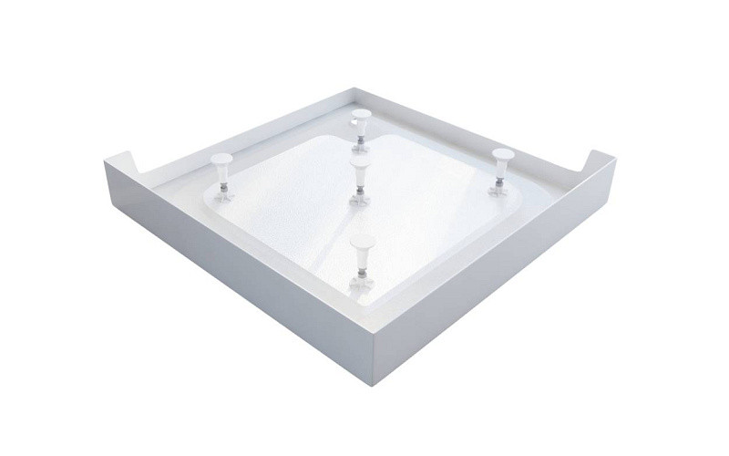 Szögletes, üvegszál erősítésű, akril tálca, integrált merevítéssel, szintező lábakkal és fali tartó konzollal