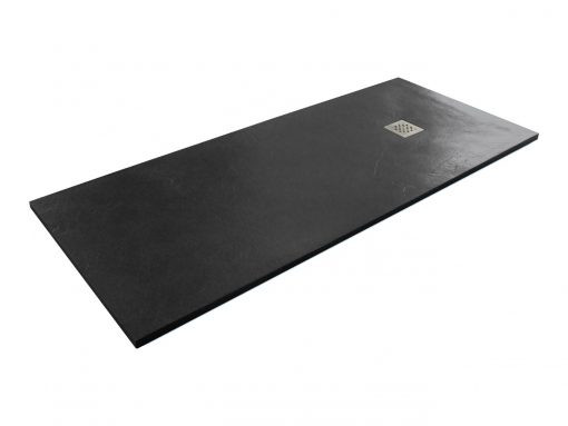 Aszimmetrikus öntött márvány zuhanytálca sötétszürke, természetes kő hatású felülettel.
